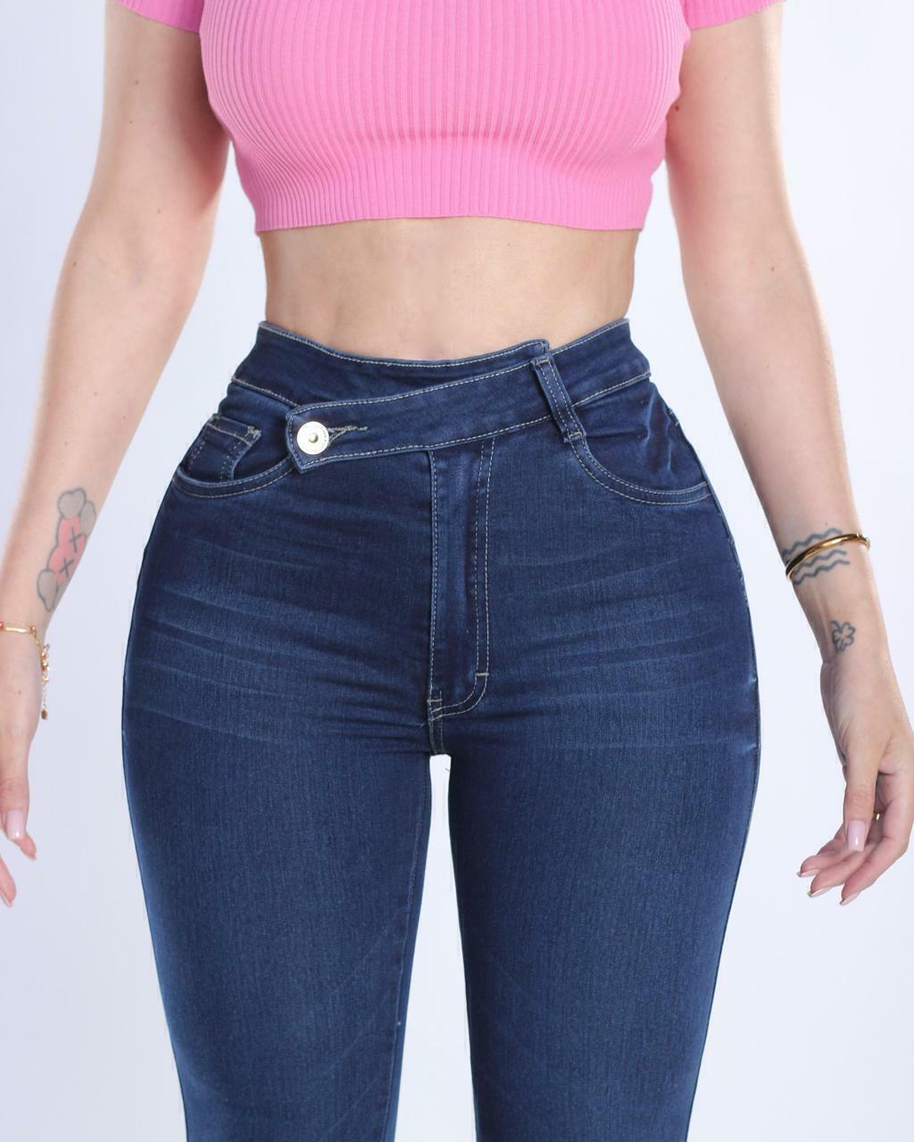 Jeans de mujer con pretina asimétrica y bolsa trasera.